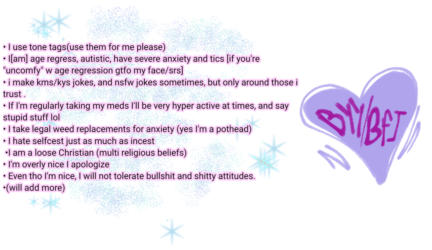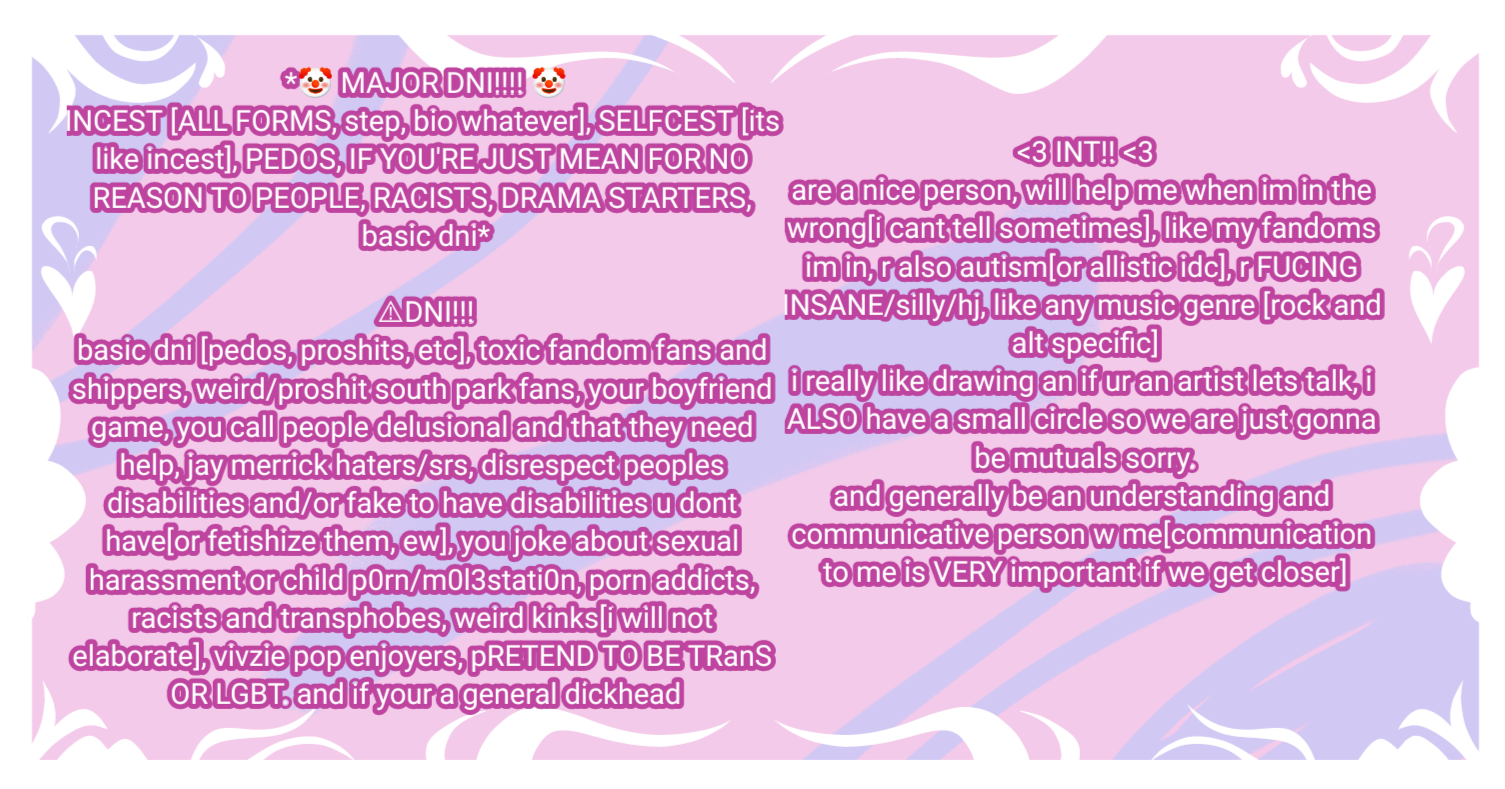 2) SHOTAS AND LOLICONS!!!!!, a proshipper, someone who fakes disorders/disabilities, whitewash, will try to flirt with me, racist, ableist, homophobic, are too aggressive(i have trauma relating to it), will judge me for stimming or acting "funny", call me a slur as a way to dehumanize me, like "your boyfriend", have a porn addiction. disrespect disorders or disabilities and age regression, are very toxic, have a bad rep of toxicity, WERE my friend but I stopped talking to you,a dream Stan or dreamsexuals, disrespect my interests/music taste(like the content not the creator), fake TT, and ask me my other DNI bc I forget